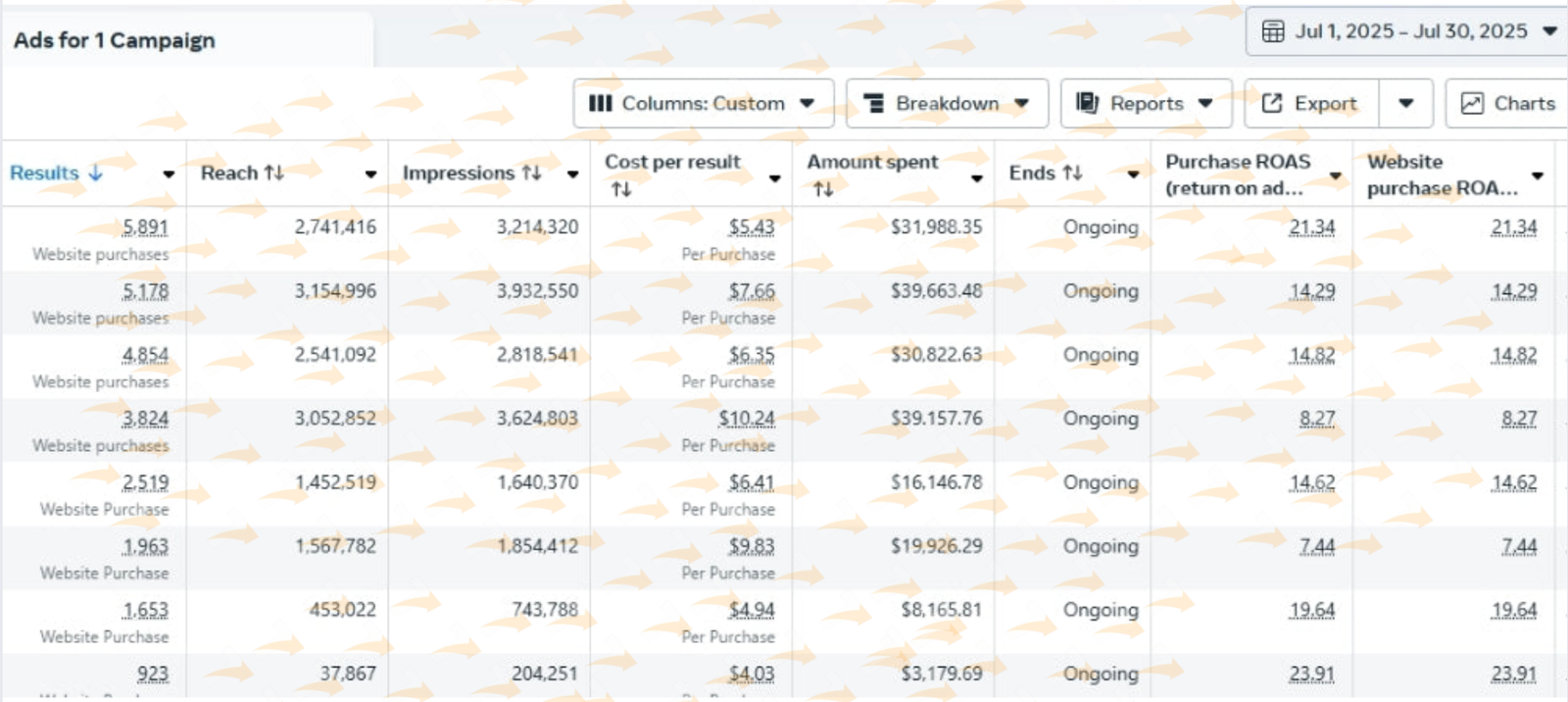 Here’s a glimpse of the actual results we generate inside our clients’ ad accounts real dashboards, real sales, real ROAS.
